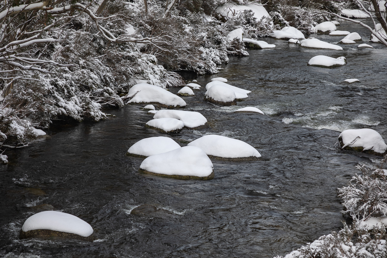 В кемпинг мы вернулись около четырех вечера и, пока не стемнело, пошли посмотреть чего там есть. Дорога, покрытая толстым слоем нетронутого снега петляла по лесу вдоль горной реки, носящей такое же название, как и лыжный курорт - Thredbo. Виды, конечно, потрясающие: такого количества снега не каждый год в Украине увидишь, а не то что в какой-то там Австралии, да ещё и в середине месяца-августа!