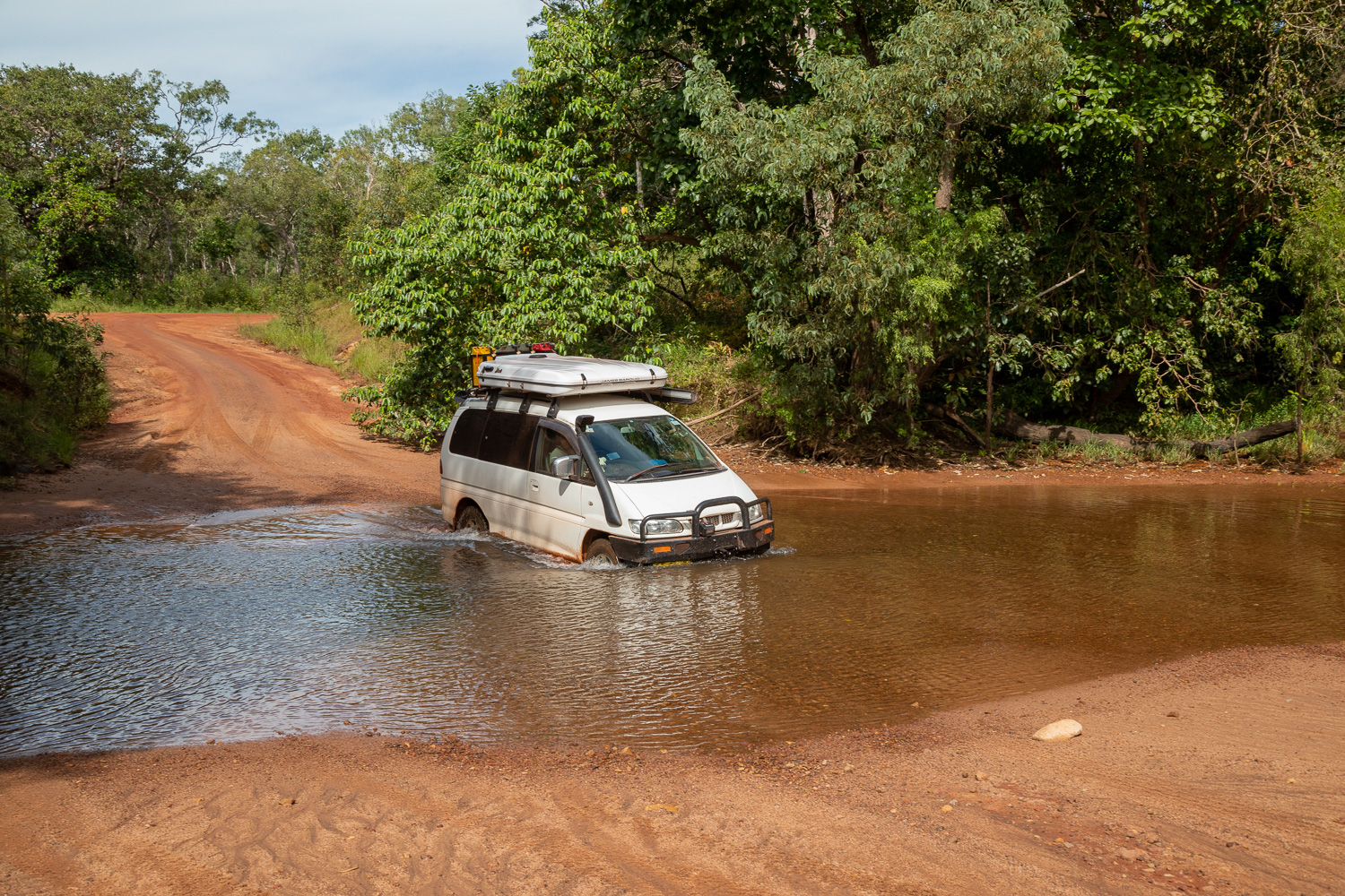 В добавок, дорога во многих местах пересекается ручьями. Если ранее, пока был асфальт, ручьи эти проходили под покрытием через специально сделанные трубы или даже мосты, то с продвижением на север это заменяется на небольшой асфальтированный участок или гравий, по которому сверху течет вода. За сотню метров от этого брода обычно просто стоит знак "DIP". Со временем это тоже закончилось и вода просто прокладывает свой путь через дорогу. И это то сухой сезон! Трудно представить что здесь происходит во время дождей.