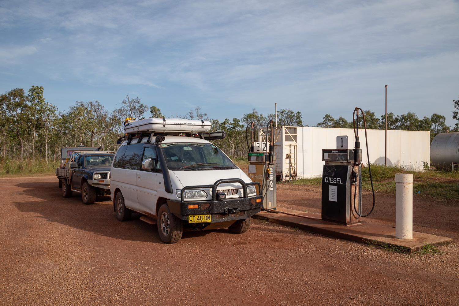 К нашему удивлению, заправок оказалось целых две! Правда, количество колонок на каждой было по-прежнему две, да и цена тоже одинакова - 175 центов за литр. Для сравнения, в Кернсе я сегодня заправлялся за 129.