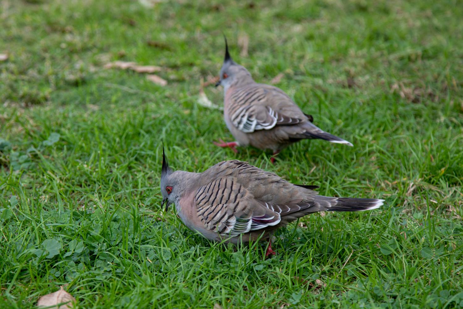 | Местные хохлатые голуби, мирно пасущиеся на лужайке. |