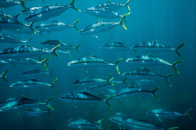 King-fish (Yellowtail amberjack) school in the natural light. Underwater. Стая желтохвостых амберджаков.